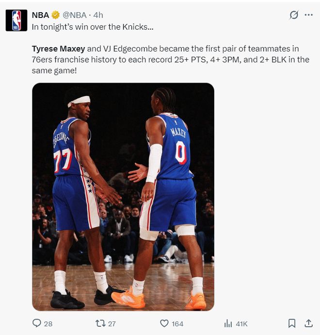 此役他与埃奇库姆成为费城队史首对拿到25+4三分+2盖帽的组合。